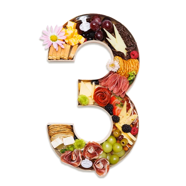 Customize your order with a number or letter charcuterie board. Items included in the letters are the same as signature fig+brie board items